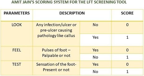 The triple assessment for foot in diabetes has 3 simple parameters, the Look, the Feel and the Test component (LFT) that addresses the triopathy (Jain, A. K. C., & Gopal, S. 2020; Jain, A. K. C. et al., 2019). Studies done on this screening tool showed that even if parameters were downsized to just 3, only 6.7% to 7.7% of feet were evaluated in different studies done on this screening tool. The author proposes a new score for this screening tool which shall open new prospects for research on this scoring system for screening.